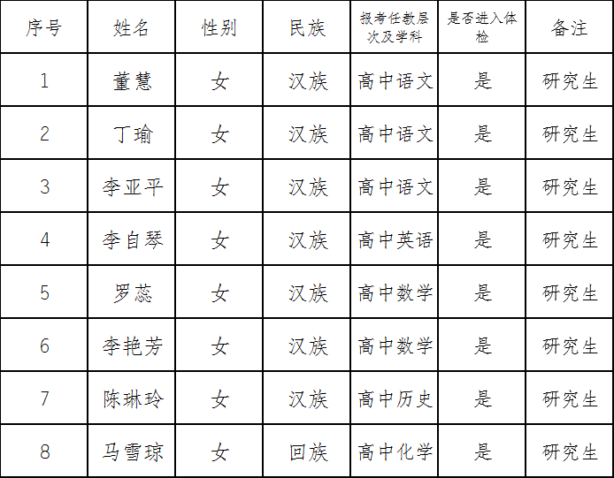 根據(jù)《曲靖市沾益區(qū)教育體育局所屬中學(xué)2019年公開招聘教師實施方案公告》的相關(guān)規(guī)定,現(xiàn)將曲靖市沾益區(qū)教育體育局所屬中學(xué)2019年公開招聘教師擬進入體檢人員名單公告如下: