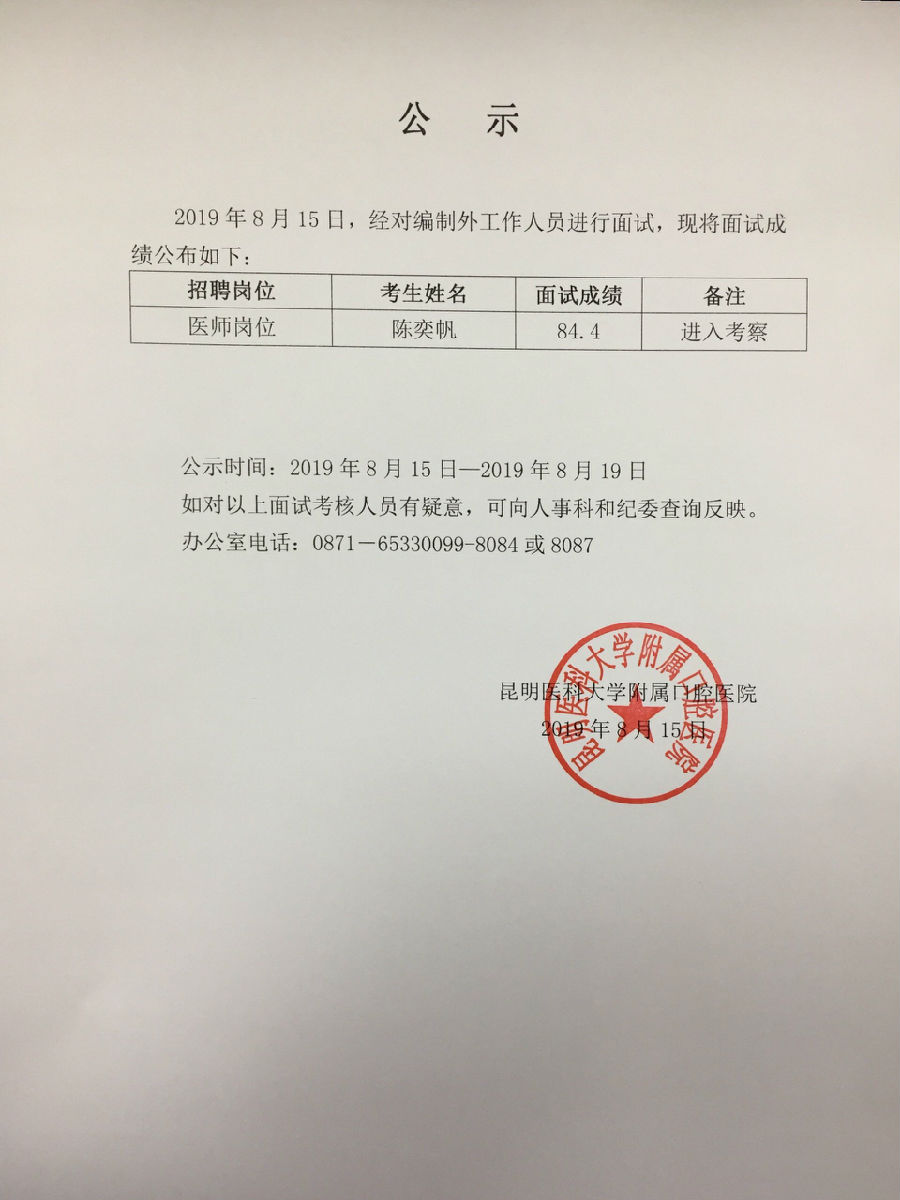 昆明醫(yī)科大學(xué)附屬口腔醫(yī)院 2019年招聘編制外人員面試成績公示