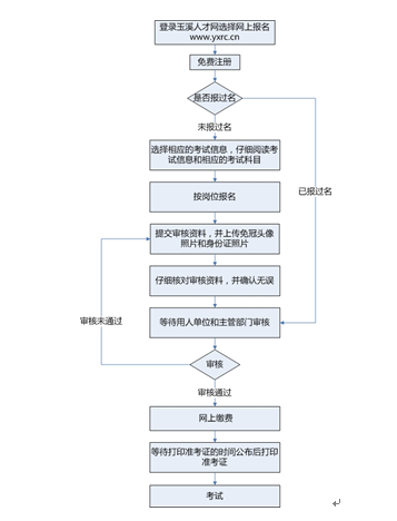 網(wǎng)絡(luò)報名的大致流程為:登錄玉溪人才網(wǎng)→網(wǎng)上報名入口→注冊→查看招聘崗位→按崗位報名并填寫報名資料→等待審核→審核通過→網(wǎng)上交費(注意查看交費狀態(tài),確認交費成功)→打印筆試準考證(打印時間在筆試公告內(nèi)另行通知)→參加筆試。