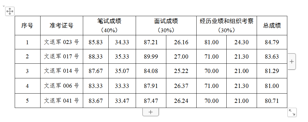 根據(jù)《文山州退役軍人事務(wù)局2019年公開遴選公務(wù)員(文秘崗位)公告》規(guī)定,經(jīng)過筆試、面試、經(jīng)歷業(yè)績評價和組織考察等環(huán)節(jié),現(xiàn)將成績予以公布: