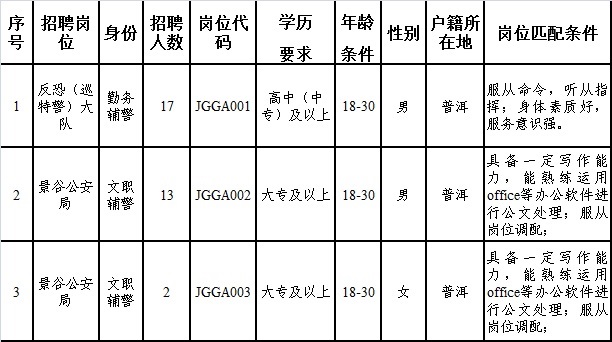 為解決公安機(jī)關(guān)警力不足困難,根據(jù)云南省人民政府辦公廳《關(guān)于印發(fā)云南省公安機(jī)關(guān)警務(wù)輔助人員管理辦法(試行)的通知》(云政辦發(fā)〔2016〕122號(hào))、普洱市公安局、中共普洱市委機(jī)構(gòu)編制辦公室、普洱市財(cái)政局、普洱市人力資源和社會(huì)保障局《關(guān)于公安機(jī)關(guān)公開招聘勤務(wù)輔警的通知》(普公發(fā)〔2017〕22號(hào))和《普洱市公安機(jī)關(guān)文職人員管理辦法(試行)》的規(guī)定,景谷傣族彝族自治縣(下簡(jiǎn)稱景谷縣)公安局面向社會(huì)公開招聘勤務(wù)輔警和文職人員(下簡(jiǎn)稱輔警)共計(jì)32人。現(xiàn)將有關(guān)事項(xiàng)公告如下: