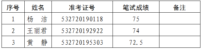 根據(jù)《普洱市婦女聯(lián)合會(huì)2019年公開(kāi)遴選參照公務(wù)員法管理單位工作人員公告》(第1號(hào)),普洱市婦女聯(lián)合會(huì)于2019年12月7日開(kāi)展了“綜合管理崗職位(職位代碼B002001)”公開(kāi)遴選的筆試工作。現(xiàn)將有關(guān)事項(xiàng)公告如下: