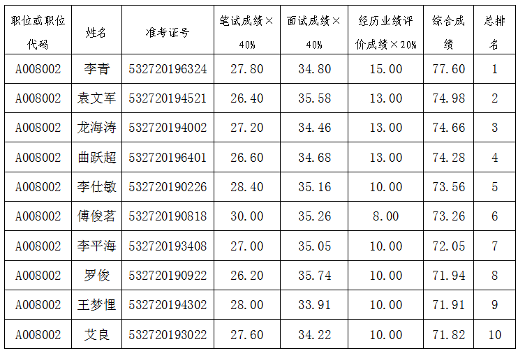 《普洱市強(qiáng)制隔離戒毒所2019年公開遴選公務(wù)員公告》(第4號(hào))已于2020年1月19日發(fā)布,因考生對(duì)A008002崗位考生傅俊茗(準(zhǔn)考證號(hào)532720190818)的“經(jīng)歷業(yè)績(jī)?cè)u(píng)價(jià)”成績(jī)提出異議,經(jīng)重新對(duì)傅俊茗考生的“經(jīng)歷業(yè)績(jī)?cè)u(píng)價(jià)”成績(jī)進(jìn)行復(fù)核確認(rèn),其確未滿足“具有5年及以上司法行政機(jī)關(guān)、公安機(jī)關(guān)、人民法院、人民檢察院工作經(jīng)歷之一”條件,所以“經(jīng)歷業(yè)績(jī)?cè)u(píng)價(jià)”成績(jī)由原來的10分更正為8分?,F(xiàn)將第4號(hào)公告第二項(xiàng)“綜合成績(jī)”中A008002崗位綜合成績(jī)及排名情況作如下更正,原《普洱市強(qiáng)制隔離戒毒所2019年公開遴選公務(wù)員公告》(第4號(hào))中其他內(nèi)容不變。