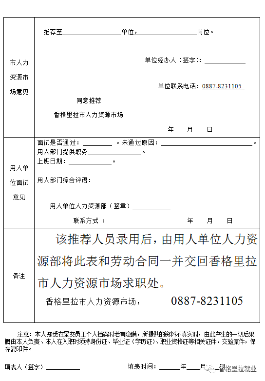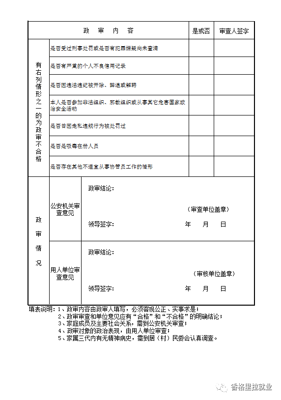 注:《香格里拉市人力資源市場新增人員政審表》由戶籍所在地派出所出具證明