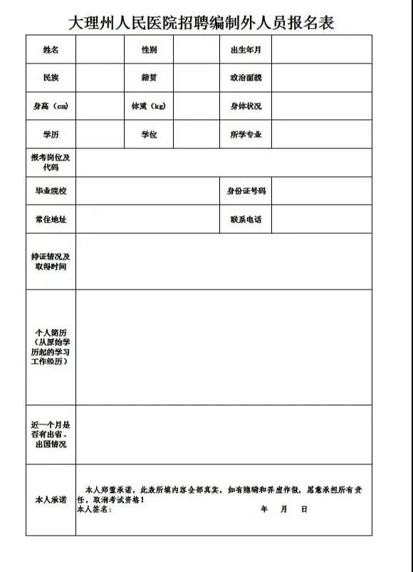 3、報名注意事項:報名人員須對照崗位要求,如實填寫《大理州人民醫(yī)院招聘編制外人員報名表》,筆試前招聘工作組將對參加考試人員進(jìn)行資格復(fù)審,凡有弄虛作假、個人信息不一致、不符合崗位要求者,取消考試資格。
