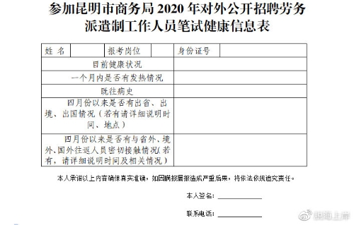 根據(jù)疫情防控要求,請參加筆試的考生,將健康信息表下載打印,如實填寫相關(guān)內(nèi)容并簽字,同時用手機掃描云南健康碼,把健康碼截圖后,一并打印,考試當(dāng)天提交考場工作人員。
