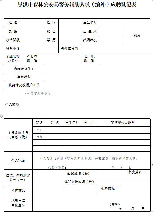 附件:《景洪市森林公安局警務(wù)輔助人員(編外)應(yīng)聘登記表》
