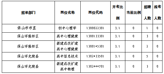 根據(jù)《保山市應對新冠肺炎疫情影響大幅增加名額面向全國開展基礎教育學校專項招聘優(yōu)秀高校畢業(yè)生公告》及有關規(guī)定,2020年保山市面向全國開展基礎教育學校專項招聘優(yōu)秀高校畢業(yè)生計劃招聘崗位106個,共計575人。網(wǎng)絡報名工作已于6月6日上午12:00結束。經(jīng)統(tǒng)計共有2659名考生通過資格審查、繳費、完成報名。在計劃招聘的106個崗位中有81個崗位(含11個不設開考比例的崗位,70個報名人數(shù)與招聘人數(shù)達到或超過3:1比例的崗位)可以正常開考;取消5個無人報考崗位招聘計劃14人;有20個崗位報名人數(shù)與招聘人數(shù)達不到3:1的比例,經(jīng)中共保山市委組織部、保山市人力資源和社會保障局、保山市教育體育局研究,并征求了保山市紀委市監(jiān)委派駐市人力資源和社會保障局紀檢監(jiān)察組意見,進行了崗位調劑,調劑后同意這20個崗位開考(含1個減少招聘計劃1人的崗位)。現(xiàn)將報名及崗位調劑情況向廣大考生進行公布(詳見附件)。