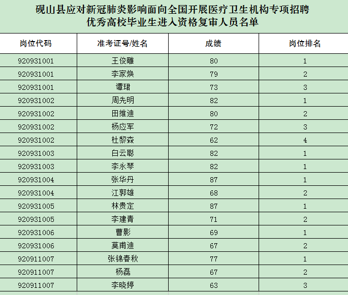 附件:硯山縣應(yīng)對新冠肺炎影響面向全國開展醫(yī)療衛(wèi)生機構(gòu)專項招聘優(yōu)秀高校畢業(yè)生進入資格復審人員名單