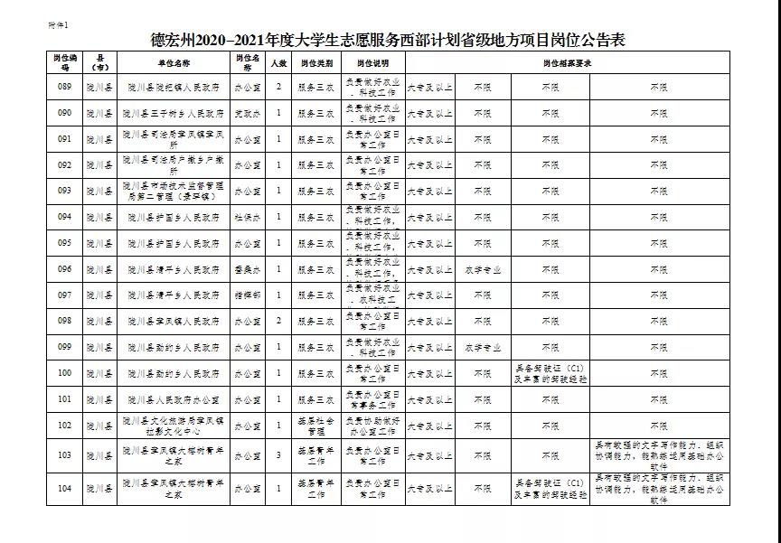 根據(jù)共青團(tuán)中央 教育部 財(cái)政部 人力資源和社會(huì)保障部《關(guān)于印發(fā)<2020-2021年度大學(xué)生志愿服務(wù)西部計(jì)劃實(shí)施方案>的通知》(中青聯(lián)發(fā)〔2020〕6號(hào))、云南省大學(xué)生志愿服務(wù)西部計(jì)劃項(xiàng)目管理辦公室《關(guān)于開展大學(xué)生志愿服務(wù)西部計(jì)劃相關(guān)工作的通知》等文件精神,現(xiàn)將德宏州2020-2021年度大學(xué)生志愿服務(wù)西部計(jì)劃省級(jí)地方項(xiàng)目志愿者招募工作有關(guān)事項(xiàng)公告如下。