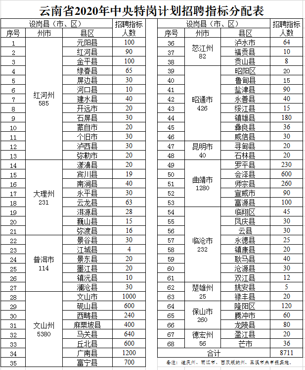 附件:云南省2020年中央特崗計劃招聘指標(biāo)分配表