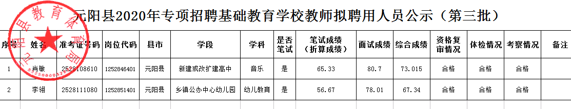 根據(jù)《紅河州應(yīng)對(duì)新冠肺炎疫情影響大幅增加名額面向全國(guó)開(kāi)展基礎(chǔ)教育學(xué)校專項(xiàng)招聘優(yōu)秀高校畢業(yè)生公告》、《紅河州教育體育局關(guān)于紅河州2020年基礎(chǔ)教育學(xué)校教師專項(xiàng)招聘資格復(fù)審、面試及體檢等有關(guān)事項(xiàng)的通知》相關(guān)規(guī)定和要求,經(jīng)報(bào)名、資格初審、筆試、資格復(fù)審、面試、體檢和考察等程序,現(xiàn)將元陽(yáng)縣2020年云南省專項(xiàng)招聘基礎(chǔ)教育學(xué)校教師第三批擬聘用人員予以公示: