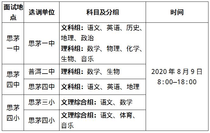 筆試時間為:2020年8月1日,地點:思茅四中,具體時間以準(zhǔn)考證為準(zhǔn)。筆試成績在思茅網(wǎng)(http://www.simaowang.com)、“思茅教育”微信公眾號公布。