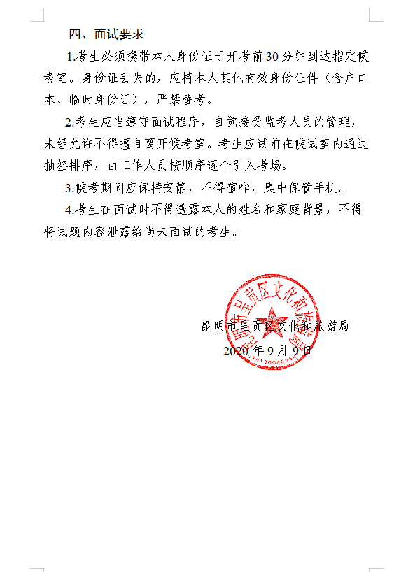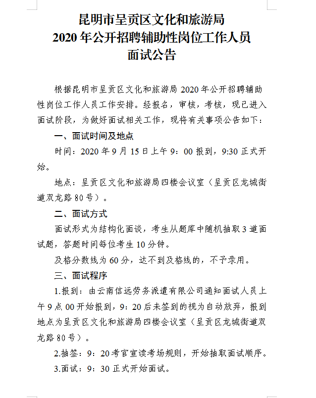 昆明市呈貢區(qū)文化和旅游局2020年招聘輔助性崗位工作人員面試公告