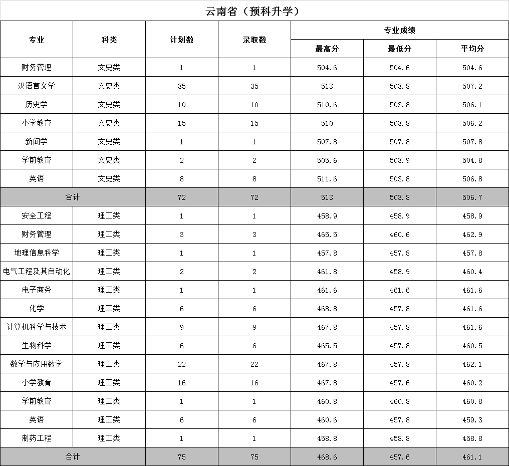 文山學(xué)院2020年招生錄取分?jǐn)?shù)統(tǒng)計(jì)三(預(yù)科升學(xué))